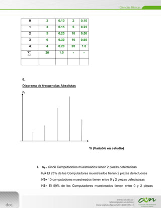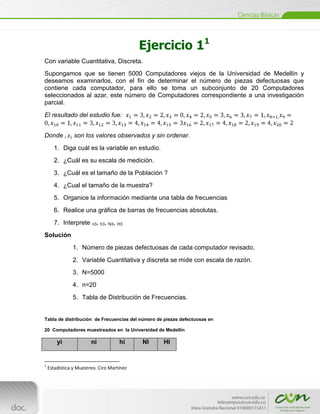 Este documento presenta dos ejercicios estadísticos. El primer ejercicio analiza datos sobre el número de piezas defectuosas en 20 computadores seleccionados al azar de una universidad. El segundo ejercicio examina datos sobre los tipos de aceite utilizados por 150 familias en una ciudad. Cada ejercicio proporciona información sobre la variable, población, muestra, tabla de frecuencias y preguntas sobre la interpretación de los resultados.
