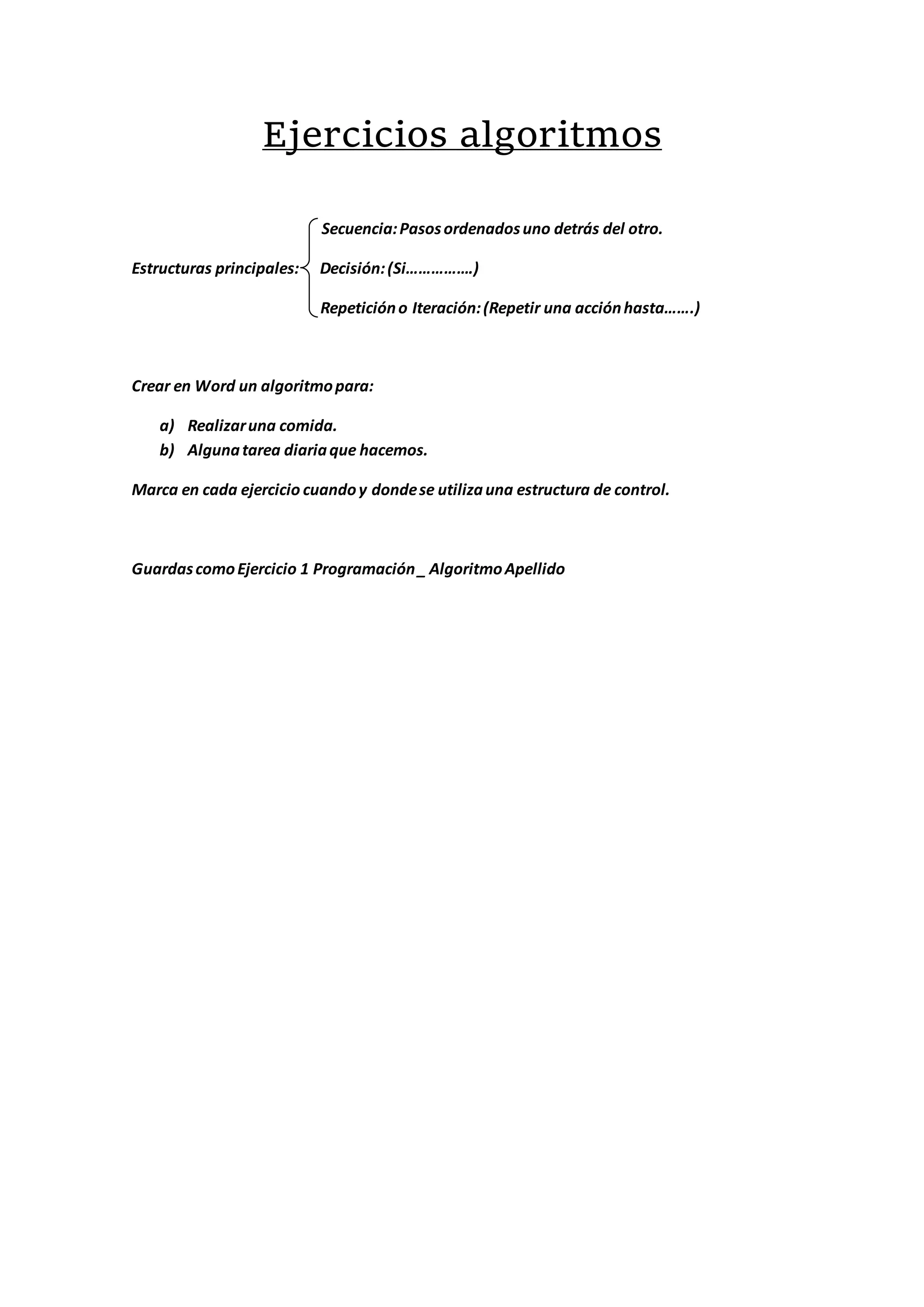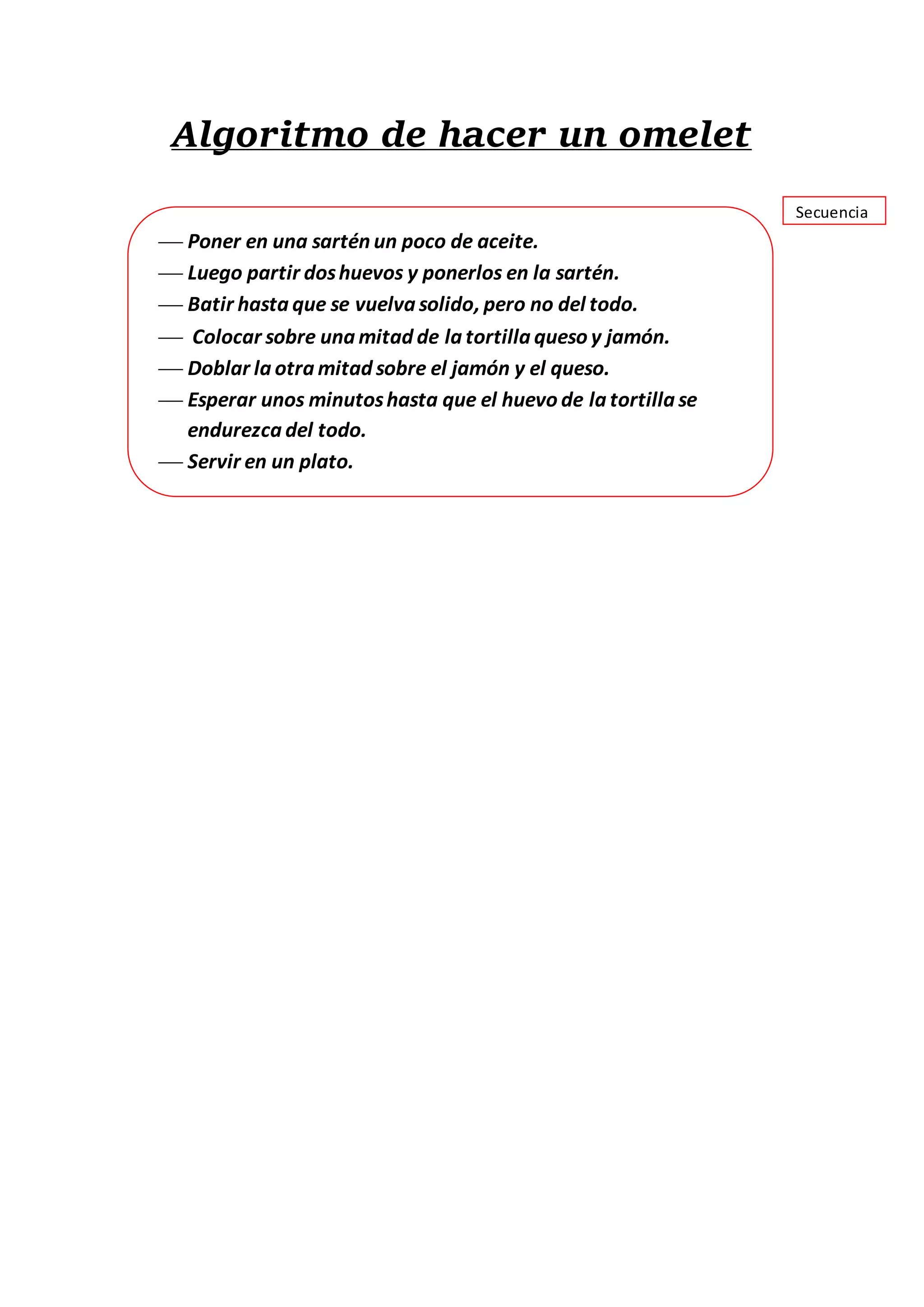 Este documento presenta dos ejemplos de algoritmos: uno para hacer un omelet y otro para poner una carga en el lavarropas. Explica las estructuras principales de los algoritmos como la secuencia de pasos y la decisión. Solicita crear algoritmos para una comida y una tarea diaria usando estas estructuras y marcando dónde se usan.