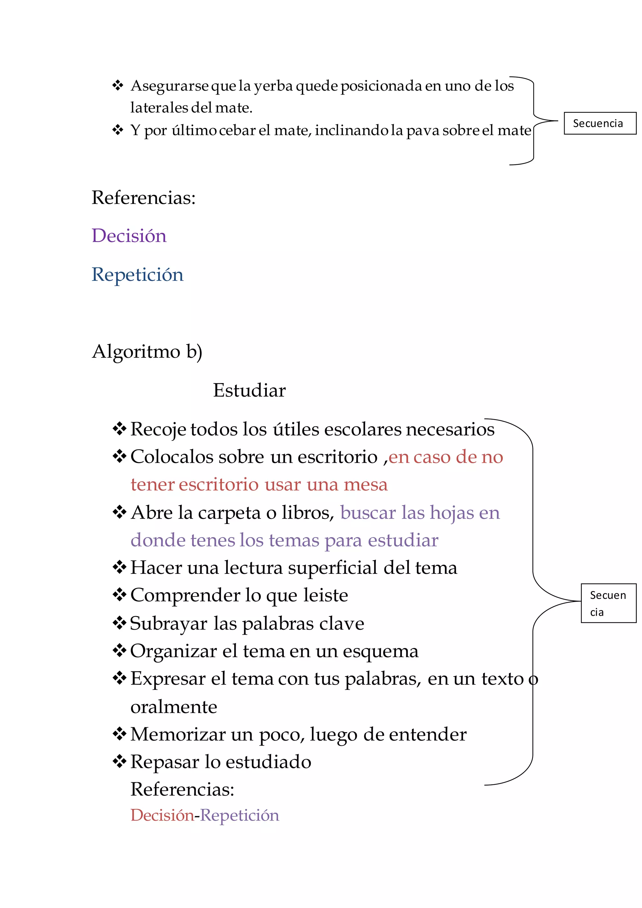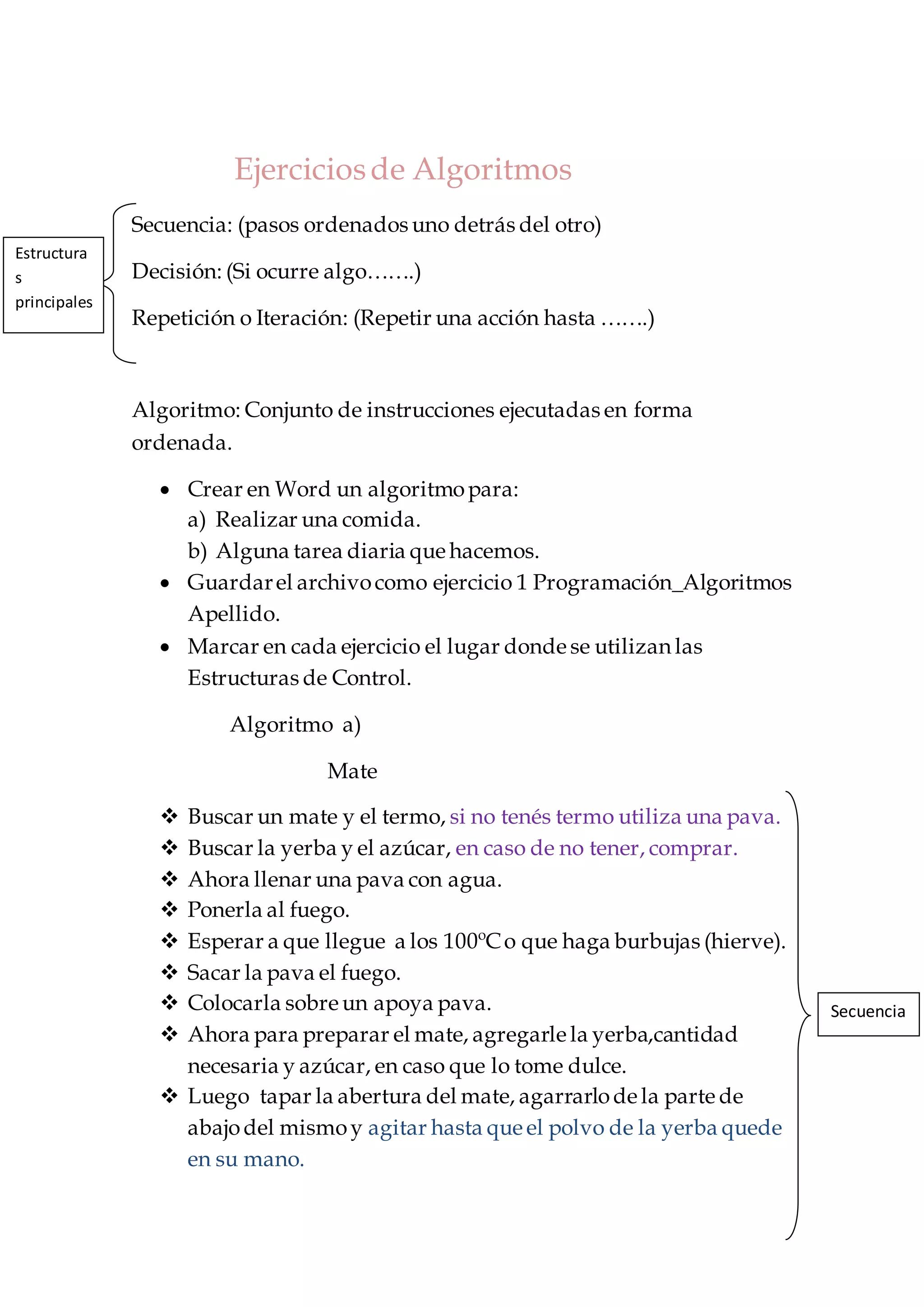 El documento describe dos algoritmos: 1) para preparar mate y 2) para estudiar. Ambos algoritmos siguen una secuencia de pasos ordenados que incluyen decisiones y repeticiones. El algoritmo para preparar mate describe los pasos para buscar los materiales necesarios, hervir el agua, cebar el mate. El algoritmo para estudiar describe los pasos para reunir los útiles, leer, comprender, subrayar, organizar y repasar el tema de estudio.