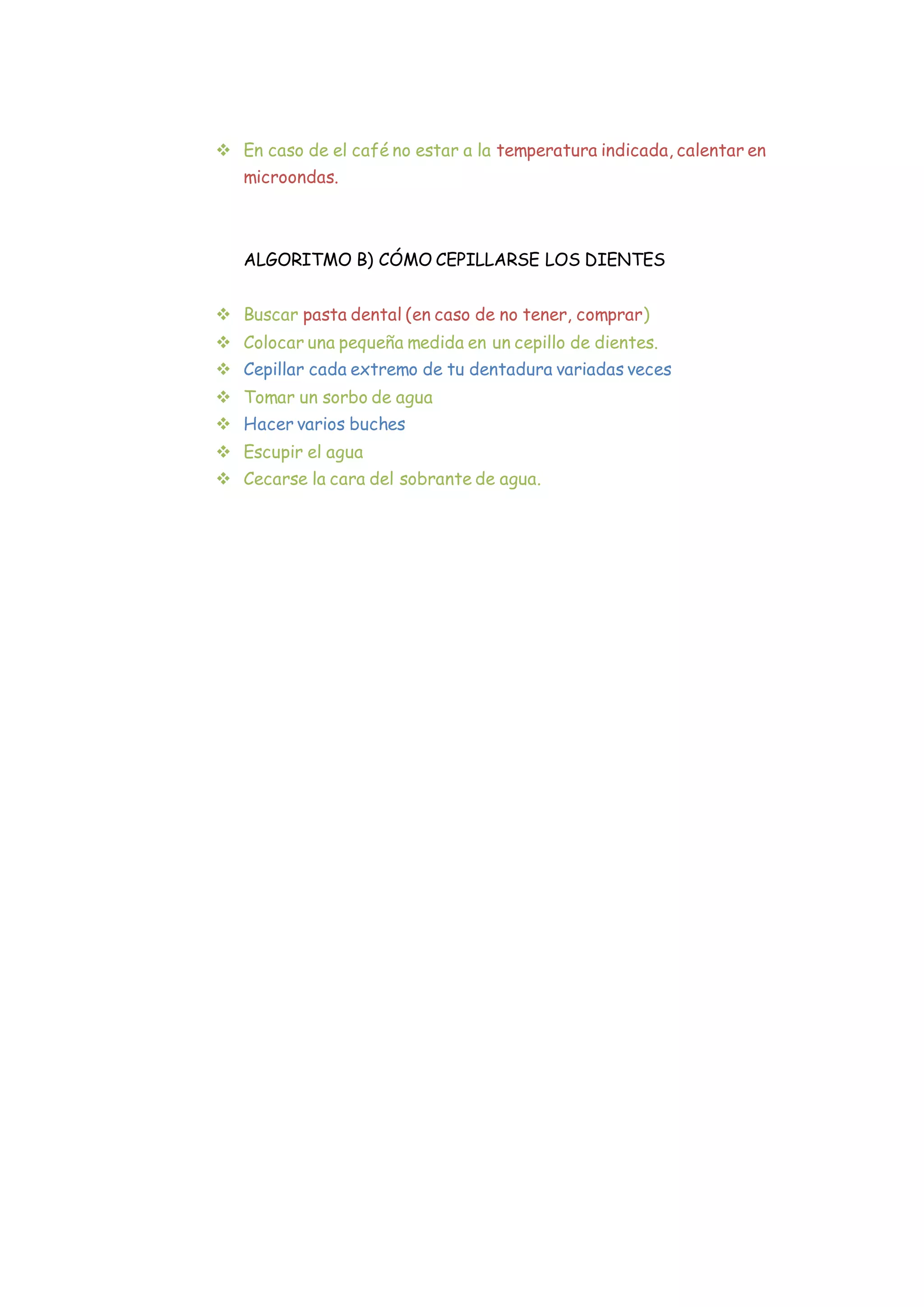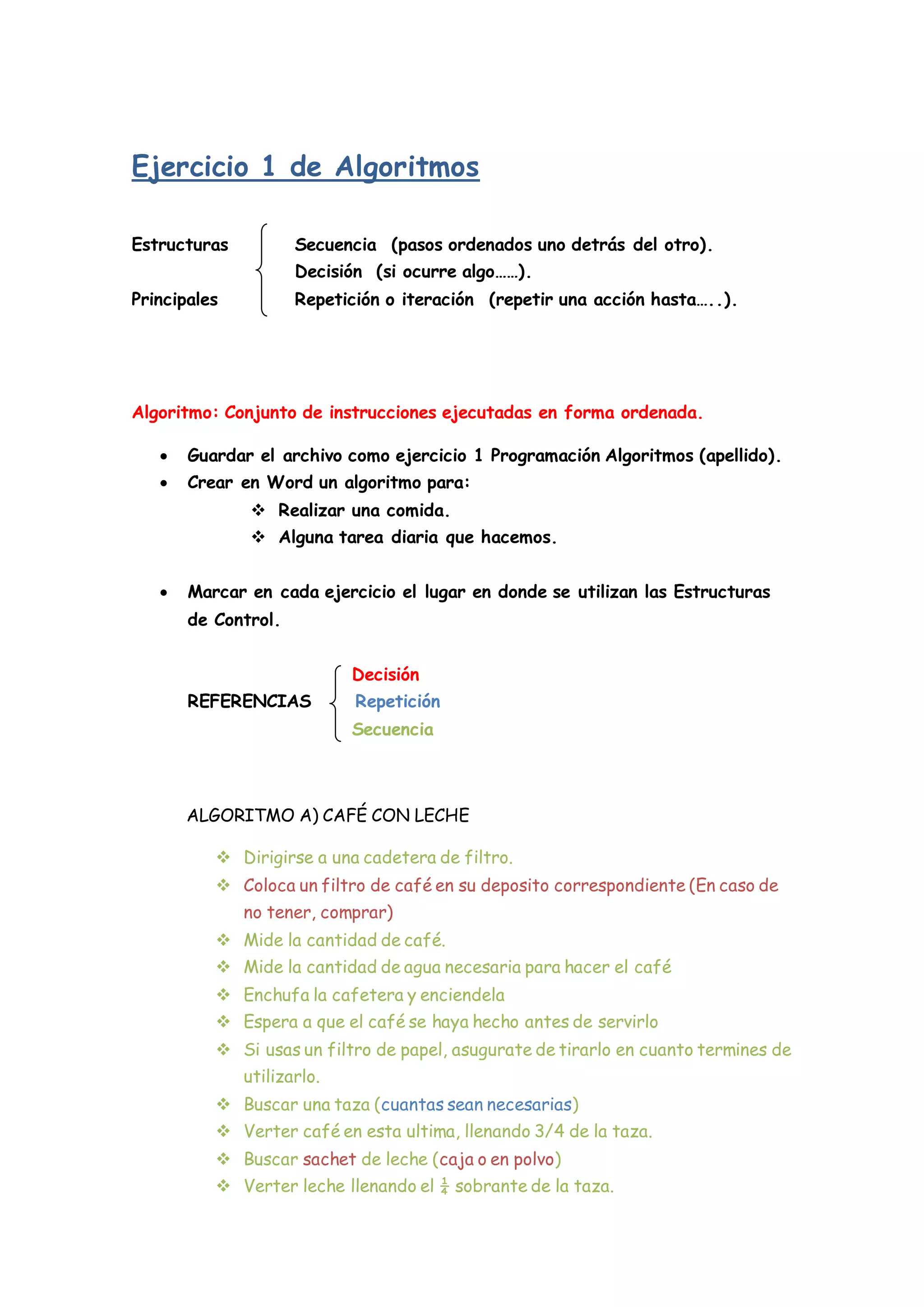 Este documento presenta dos algoritmos: uno para hacer café con leche y otro para cepillarse los dientes. Cada algoritmo contiene una secuencia de pasos ordenados que describen el proceso. También incluyen estructuras de decisión, como comprobar si se necesita comprar un filtro de café o pasta dental antes de comenzar. Los algoritmos utilizan repetición al indicar cepillar varias veces o hacer varios buches.