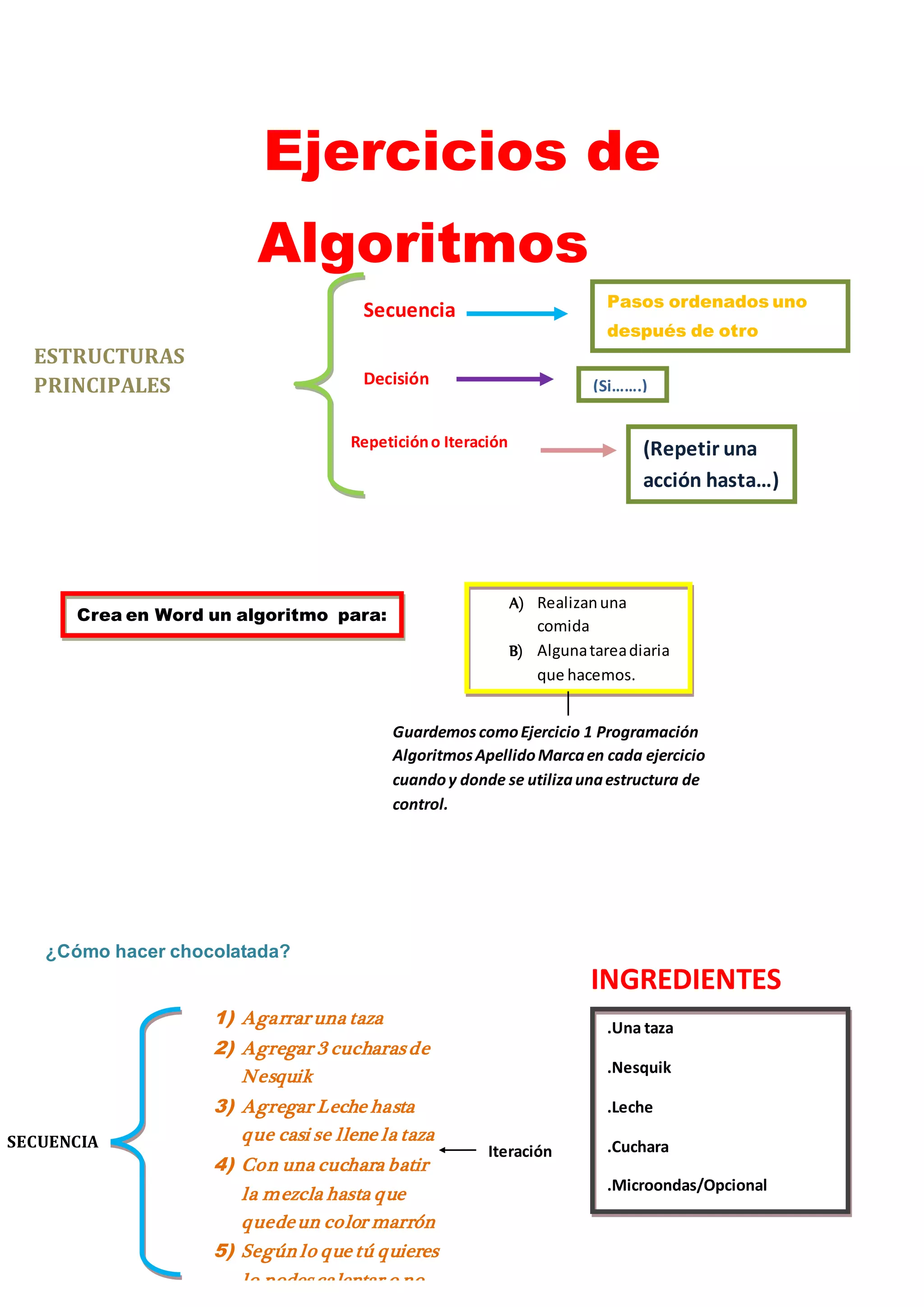 El documento presenta dos algoritmos: uno para hacer chocolatada y otro para atarse los cordones. El algoritmo para hacer chocolatada contiene 5 pasos secuenciales e incluye una iteración para batir la mezcla. El algoritmo para atarse los cordones tiene 8 pasos secuenciales. Ambos algoritmos especifican los ingredientes o materiales necesarios y la estructura de control utilizada, ya sea secuencia o iteración.