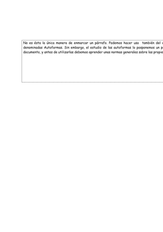 El documento habla brevemente sobre diferentes maneras de enmarcar un párrafo, incluyendo el uso de autoformas. Sin embargo, el estudio de las autoformas se pospone para más adelante en el documento, y antes de usarlas es importante aprender las normas generales sobre sus propiedades.