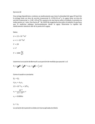 Una jeringa contiene un medicamento con densidad igual al agua. Tiene un área de sección transversal de 2.5x10-5 m2 en el barril y 1x10-8 m2 en la aguja. Una fuerza de 2N actúa sobre el émbolo, haciendo que el medicamento salga horizontalmente por la aguja. Usando la ecuación de Bernoulli, se determina que la velocidad del medicamento al salir de la aguja es de 12.6 m/s.