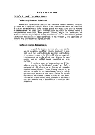 El documento discute el creciente desarrollo de los robots industriales y su uso para sustituir la mano de obra humana en procesos de fabricación (robotización), lo que según algunos puede destruir puestos de trabajo pero para otros aumenta la productividad. También analiza los avistamientos de ovnis desde 1947 y cómo se ha popularizado la idea de que algunos de estos objetos podrían ser naves espaciales extraterrestres.
