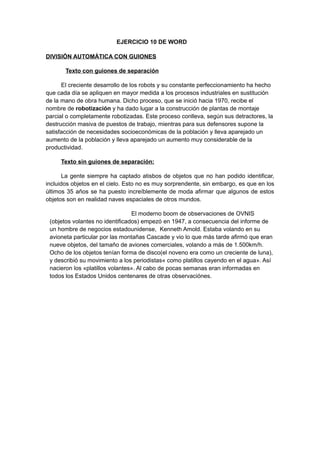 El documento habla sobre el desarrollo de la robotización industrial y sus efectos. Explica que el uso cada vez mayor de robots en la industria desde 1970 ha dado lugar a fábricas parcial o totalmente automatizadas. Mientras que algunos creen que esto conduce a la pérdida masiva de puestos de trabajo, otros argumentan que satisface las necesidades socioeconómicas de la población y aumenta mucho la productividad.