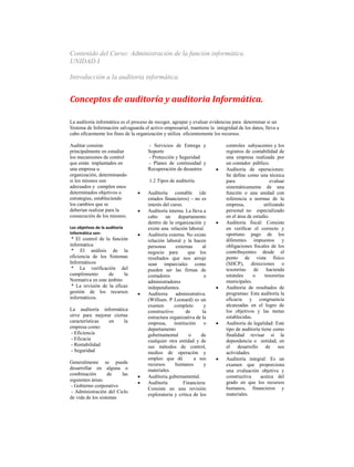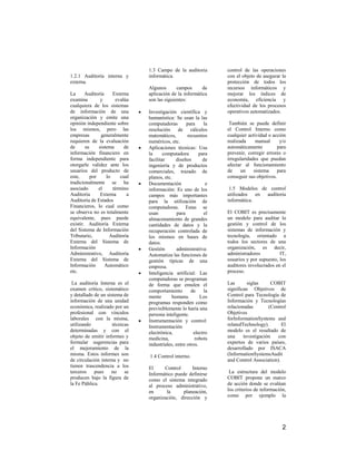 Este documento presenta una introducción a la auditoría informática. Define la auditoría informática como el proceso de evaluar si un sistema de información protege los activos de una empresa, mantiene la integridad de datos y utiliza recursos de manera eficiente. Explica los tipos de auditoría como contable, interna, externa y administrativa. También describe los campos de aplicación de la informática y modelos de control como COBIT utilizados en la auditoría informática.
