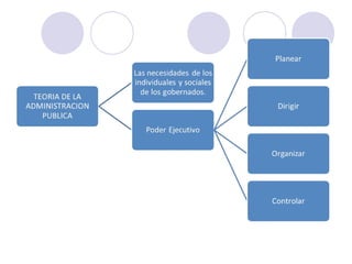El documento habla sobre la administración pública en México. Explica que la administración pública federal incluye diferentes secretarías y órganos que se encargan de tareas específicas de manera interdependiente. También menciona que la administración pública mexicana ha evolucionado y diversificado sus funciones a lo largo de los años para hacer frente al crecimiento de la población y las nuevas tareas asumidas por el Estado.