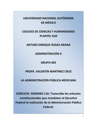 El documento resume los artículos constitucionales que mandatan al Ejecutivo Federal la realización de la Administración Pública Federal en México. El Artículo 90 establece que la Administración Pública Federal será centralizada y paraestatal, y distribuirá los negocios administrativos de la Federación entre las Secretarías de Estado. El Artículo 91 establece los requisitos para ser secretario de Estado. El Artículo 92 establece que todos los reglamentos y órdenes del Presidente deben estar firmados por el Secretario de Estado correspondiente. El Artículo