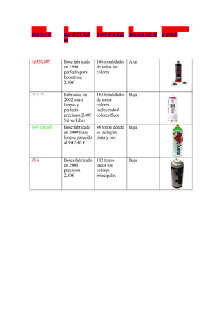El documento lista cuatro marcas de sprays de pintura, incluyendo detalles sobre el año de fabricación, colores disponibles, presión y precio para cada marca. Las marcas son Hardcore, MTN 94, Day Colors y NBQ, fabricadas entre 1996 y 2009, con un rango de 98 a 152 colores disponibles incluyendo plata, oro y fluor, y precios entre 2,40€ y 2,90€.