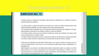 Este documento presenta la reflexión de un estudiante sobre la realización del Ejercicio 12 en Access. El estudiante menciona que el ejercicio le resultó fácil porque los registros proporcionaban la mayoría de los datos requeridos. También explica que olvidó agregar una clave principal a las tablas de unión mientras realizaba este ejercicio y el Ejercicio 11 al mismo tiempo, pero que pudo resolverlo una vez que recordó este paso. El estudiante concluye que siente que ha avanzado en su familiarización con Access y el