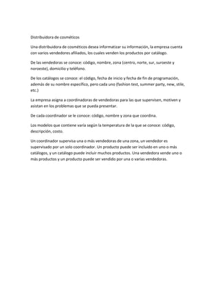 La distribuidora de cosméticos desea informatizar su información sobre vendedores, coordinadores, catálogos y productos. La empresa tiene vendedores afiliados que venden productos por catálogo. De las vendedoras se conoce su código, nombre, zona, domicilio y teléfono. Los catálogos tienen un código, fechas de inicio y fin, y nombre. Las coordinadoras supervisan y asisten a las vendedoras de una zona en particular. De los productos se conoce su código, descripción y costo. Un coordin