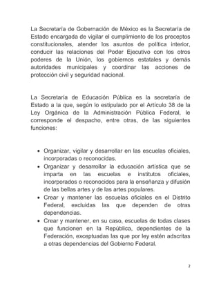 La Secretaría de Gobernación es responsable de vigilar el cumplimiento de la Constitución, atender asuntos de política interior, conducir las relaciones entre poderes de gobierno, coordinar protección civil y seguridad nacional. La Secretaría de Educación Pública se encarga de organizar, vigilar y desarrollar la educación en escuelas oficiales e institutos, así como promover la investigación científica y tecnológica en el sector educativo. La Secretaría de Hacienda y Crédito Público calcula los ingresos y eg
