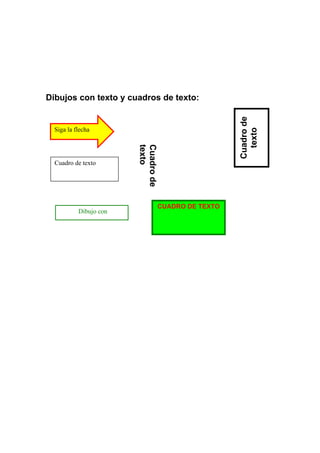 El documento describe diferentes formas geométricas y elementos gráficos como líneas, flechas, cintas, estrellas y círculos en 3D. También incluye instrucciones de dibujo con cuadros de texto y flechas para guiar al lector.