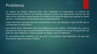 La cadena de hoteles Descansa Feliz busca automatizar su sistema de reservas en línea, requiriendo un diseño de base de datos que registre información sobre hoteles, tipos de habitaciones y clientes. Se deben almacenar detalles de reservas tanto de particulares como de agencias de viajes, incluyendo datos del huésped, precio, y fechas de la reserva. La actividad fue interesante y útil para repasar conceptos de manejo de registros y atributos.