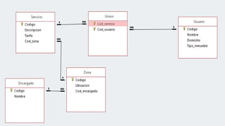 El documento describe el requerimiento del gobierno municipal de Tepic para automatizar el cobro de agua potable y alcantarillado. Se necesita diseñar una base de datos en Access que almacene información sobre usuarios (código, nombre, domicilio, tipo de inmueble), servicios (código, descripción, tarifa) organizados por zonas (código, ubicación), y encargados (código, nombre) asignados a zonas.