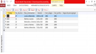 El documento describe la organización de una liga infantil de béisbol y la información que se desea sistematizar sobre ella. La liga se organiza por categorías de edad, cada una con uno o más grupos. Los grupos tienen un horario y días de entrenamiento, y cada uno pertenece a una sola categoría. Los alumnos se inscriben en un grupo y realizan pagos como cuotas o equipamiento.