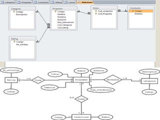 La empresa de radio y televisión solicitó al departamento de informática automatizar la información sobre sus programas de radio y televisión, que incluye el código, nombre, temática, duración y día de transmisión de cada programa. Cada programa pertenece a una categoría con su código y descripción, y puede tener varios conductores y calificaciones de rating.