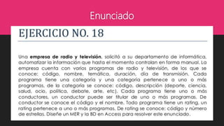 Este documento presenta el resumen de un ejercicio realizado por un estudiante sobre la creación de tablas y relaciones en Access. El estudiante explica que creó cuatro tablas (Categoría, Conductor, Programa, Rating) y las relacionó en Access. Además, comenta que el ejercicio le resultó fácil debido al pequeño número de registros y atributos en cada tabla, excepto en la tabla Programa. El estudiante concluye que en general fue un buen trabajo.
