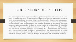 Este documento describe una empresa procesadora de productos lácteos que desea organizar su información digitalmente para realizar consultas y reportes. La empresa tiene varias sucursales con códigos y nombres únicos, cada una dirigida por un gerente. Cada sucursal produce uno o más productos con códigos, fechas de caducidad y nombres. Los productos se entregan a una o más marcas para su distribución por camiones, donde cada elemento tiene sus propios códigos e información de identificación.