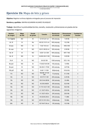 Este documento presenta un ejercicio para identificar las características técnicas de 20 archivos digitales, incluyendo su profundidad de bits, tamaño, resolución y dimensiones. Se solicita determinar si cada archivo es de mapa de bits o escala de grises, y proveer sus medidas en pixeles, resolución de entrada y cantidad de canales de color. El objetivo es registrar los archivos entregados para el proceso de impresión.