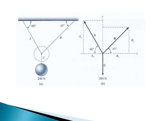 Una pelota de 200 N cuelga de una cuerda unida a otras dos cuerdas. Se aplica el equilibrio de fuerzas para encontrar las tensiones desconocidas en las cuerdas A, B y C. Se construye un diagrama de cuerpo libre y se escriben ecuaciones para las fuerzas a lo largo de los ejes x y y. Se resuelven las ecuaciones simultáneamente para encontrar que la tensión en A es 147 N, en B es 104 N, y en C es 200 N, igual al peso de la pelota.