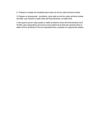 La empresa comercial del Sur S.A. está preparando su presupuesto para 2002. Se proporcionan las ventas pronosticadas para los primeros cuatro meses del año, así como datos del balance general de 2001, incluido el efectivo, cuentas por cobrar, inventario y cuentas por pagar. Adicionalmente, se detallan políticas sobre cobros de ventas, costos de ventas, gastos variables y fijos, inventarios finales, pagos de compras y una nueva política de efectivo que establece un saldo mínimo. Se pide preparar presup