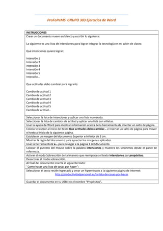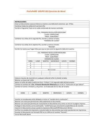 El documento proporciona instrucciones detalladas para crear dos documentos de Word con tablas y formato. La primera parte instruye cómo crear un documento con listas numeradas y con viñetas. La segunda parte instruye cómo crear una tabla de horario escolar con dos tablas divididas y aplicar formato de fuente, estilo de tabla y encabezados. Finalmente, se instruye proteger el documento, imprimirlo y guardarlo como PDF.