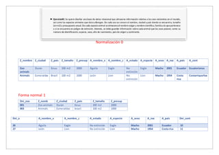 Este documento describe el proceso de normalización de una base de datos sobre zoológicos y animales. Inicialmente presenta la información en forma normal 0, luego la normaliza en las formas normales 1, 2 y 3, dividiendo la información en tablas relacionadas por llaves primarias y foráneas.