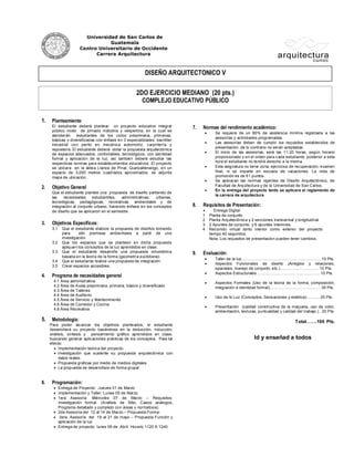 Este documento describe un proyecto arquitectónico para diseñar un complejo educativo público mixto en Quetzaltenango, Guatemala. El proyecto debe incluir espacios para preprimaria, primaria, básica y diversificada, con tres especialidades técnicas. Los estudiantes deben presentar planos, secciones y renders que muestren el diseño funcional y formal del complejo, aplicando conceptos de diseño y luz aprendidos en clase. El proyecto será evaluado en función de sus aspectos funcionales, estructurales,