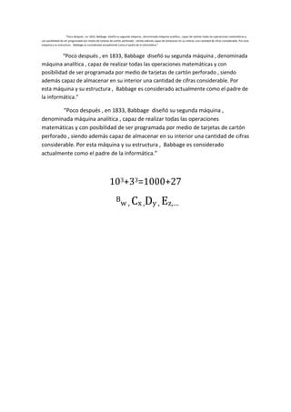 El documento instruye al lector a copiar y pegar un párrafo sobre Charles Babbage cinco veces para practicar el uso de fuentes, estilos y tamaños de letra en Word. El párrafo describe el diseño de la segunda máquina de Babbage, llamada la máquina analítica, y por qué se le considera el padre de la informática.