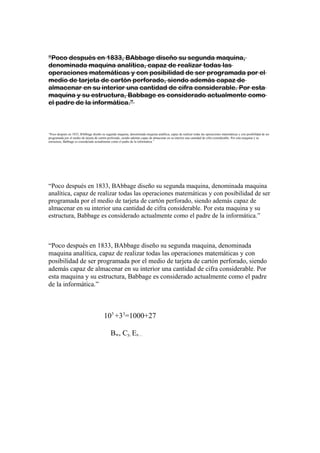 “Poco después en 1833, BAbbage diseño su segunda maquina, denominada maquina analítica, capaz de realizar todas las operaciones matemáticas y con posibilidad de ser