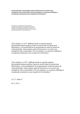 El documento describe la máquina analítica diseñada por Charles Babbage en 1833, que podía realizar operaciones matemáticas y ser programada mediante tarjetas perforadas, y tenía la capacidad de almacenar grandes cantidades de datos. Debido a esta máquina innovadora, Babbage se considera el padre de la informática.