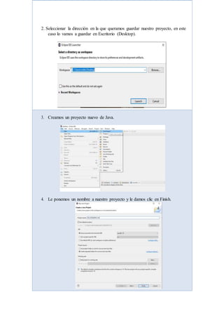 Este documento presenta el desarrollo de un programa en Eclipse para ingresar 10 números enteros, calcular la suma, promedio, número mayor, número menor y cantidad de veces que se repite cada número. El programa utiliza arreglos unidimensionales para almacenar los números ingresados y bucles para realizar los cálculos requeridos.
