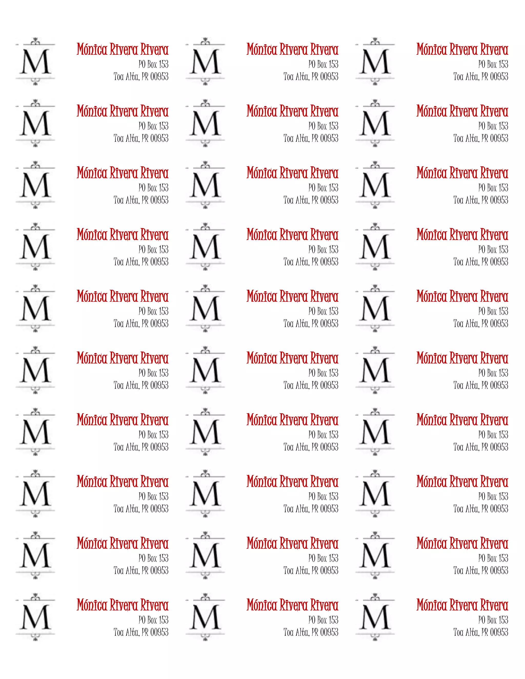 El documento repite la misma información de contacto de Mónica Rivera Rivera incluyendo su nombre, dirección postal en P.O. Box 153, Toa Alta, PR 00953 por 10 veces.
