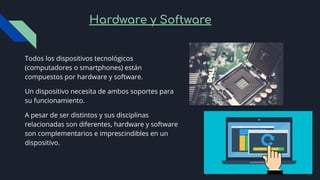 Este documento describe la diferencia entre hardware y software, y explica que el hardware son los componentes físicos de un dispositivo mientras que el software son las aplicaciones e instrucciones. También define el sistema operativo como software que gestiona los recursos hardware y provee servicios a otros programas. Finalmente, proporciona ejemplos de sistemas operativos populares para diferentes tipos de dispositivos.