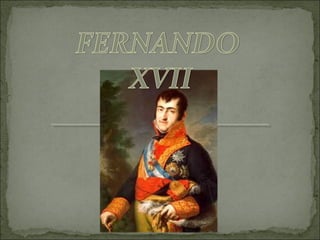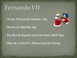 Fernando VII fue rey de España entre 1808 y 1833. Nació en El Escorial en 1784 y murió en Madrid en 1833. Derrocó a sus propios padres, Carlos IV y María Luisa de Parma, para gobernar él mismo. No era muy querido por el pueblo español.