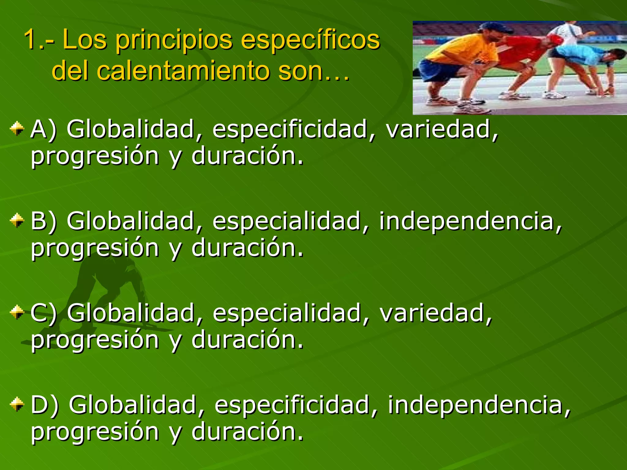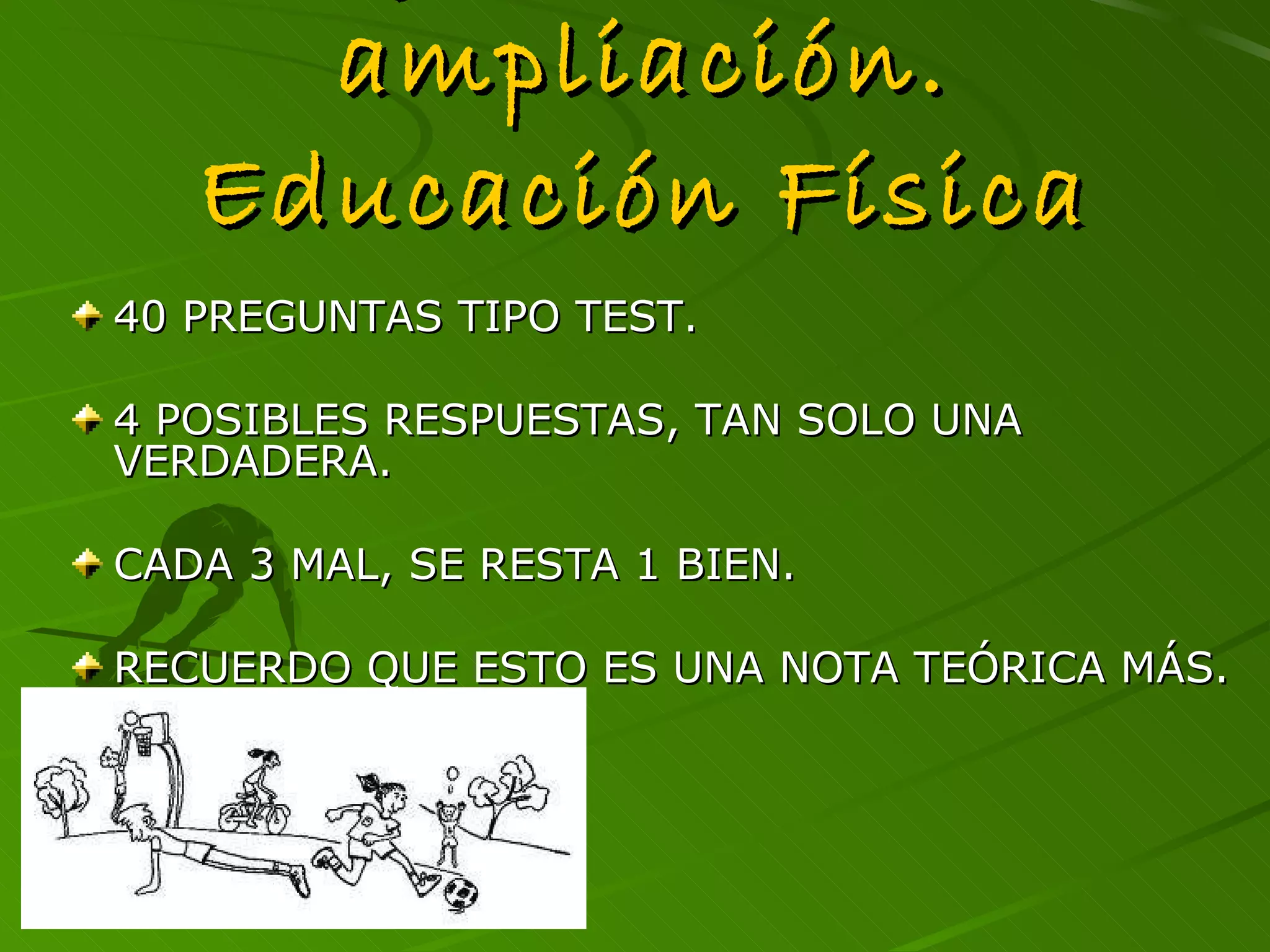 Este documento presenta 40 preguntas de tipo test sobre educación física, con 4 opciones de respuesta para cada pregunta. El objetivo es evaluar conocimientos sobre diversos temas como calentamiento, acrosport, resistencia, baloncesto, balonmano, malabares y escalada. Se indica que cada 3 respuestas incorrectas se restará 1 acierto en la nota final.