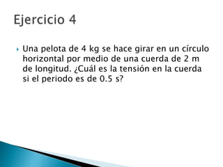 Este documento describe cómo calcular la tensión en una cuerda que gira una pelota de 4 kg en un círculo horizontal de 2 m de longitud con un periodo de 0.5 s. Explica que la tensión en la cuerda es igual a la fuerza centrípeta necesaria para mantener el movimiento circular, la cual depende de la velocidad y masa de la pelota. Proporciona las fórmulas para calcular la velocidad, fuerza centrípeta y tensión requerida.