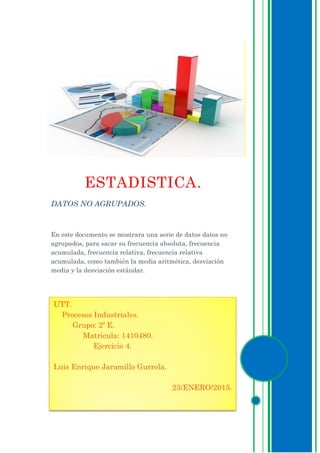 El documento presenta un análisis estadístico de datos no agrupados sobre los niveles de alcohol en sangre de 300 conductores. Se incluyen cálculos de frecuencias, media aritmética, mediana, moda y medidas de dispersión, así como gráficos que muestran la distribución de la frecuencia. Se concluye que el promedio del alcohol en sangre es de 0.55, sugiriendo un riesgo significativo de accidentes automovilísticos.
