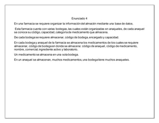 Este documento describe los requisitos para organizar la información de un almacén de una farmacia en una base de datos. La farmacia tiene varias bodegas con anaqueles para almacenar medicamentos. Se necesita almacenar información como el código, capacidad y encargado de cada bodega, así como el código de medicamento, nombre comercial, ingrediente activo y laboratorio de cada medicamento almacenado en un anaquel. Un medicamento se almacena en una sola bodega y anaquel, mientras que un anaquel puede almacenar múlt