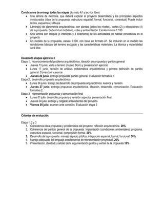 Este documento describe un proyecto final de semestre para desarrollar una propuesta de diseño arquitectónico para un nuevo museo. El proyecto se desarrollará en tres etapas que incluyen el análisis del problema, el desarrollo de una propuesta conceptual y su representación final. El estudiante debe crear planos, modelos y presentaciones para proponer un diseño para el Museo Stom en Chiguayante que satisfaga sus necesidades espaciales y de exhibición. El proyecto será evaluado en base a la coherencia de la idea con