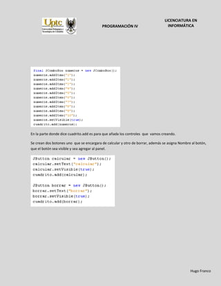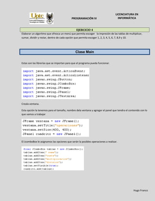 Este documento describe un algoritmo que ofrece un menú con opciones para calcular tablas de multiplicar, sumar, restar y dividir. El algoritmo crea una interfaz gráfica con un cuadro combinado para seleccionar la operación y botones para calcular y borrar. Dependiendo de la opción seleccionada, el algoritmo realiza la operación correspondiente y muestra el resultado en un área de texto.