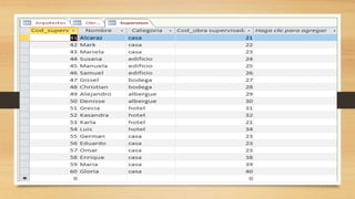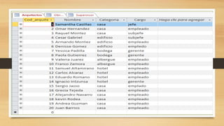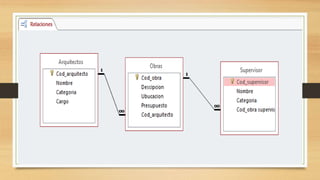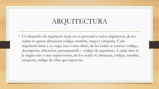 Este documento describe la información de un despacho de arquitectos que incluye el código, nombre, cargo y categoría de cada arquitecto, así como el código, descripción, ubicación, presupuesto y código de arquitecto de cada obra a su cargo. Además, detalla el código, nombre, categoría y código de obra supervisada de cada supervisor asignado a una obra.