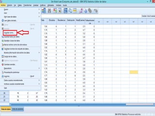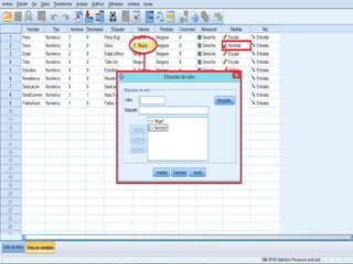 Este documento proporciona instrucciones sobre cómo crear y completar variables en el programa SPSS. Explica cómo abrir SPSS, crear variables en la hoja de vista de variables designando su tipo y formato, completar los datos en la hoja de vista de datos, y guardar el archivo con extensión .sav.