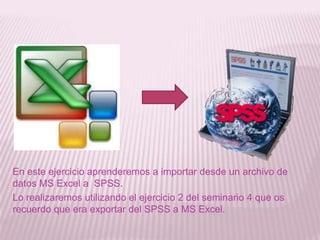Este documento describe cómo importar datos de un archivo Excel a SPSS. Explica que al importar los datos, aparece un cuadro de diálogo que permite seleccionar opciones como leer los nombres de variables de la primera fila, la hoja de trabajo y el rango a importar. Una vez importados los datos, se debe guardar el archivo resultante en SPSS.