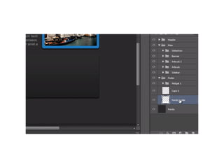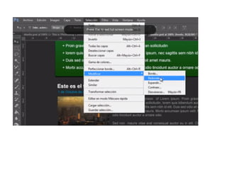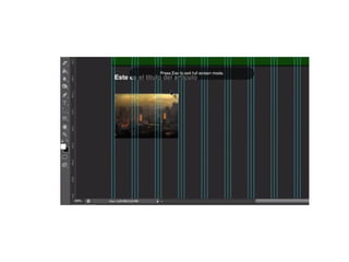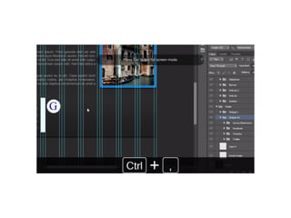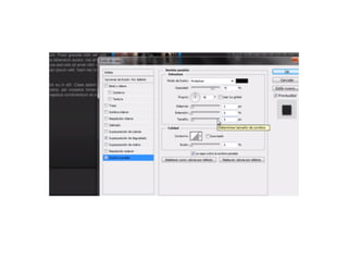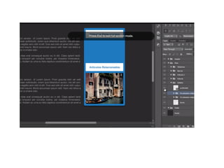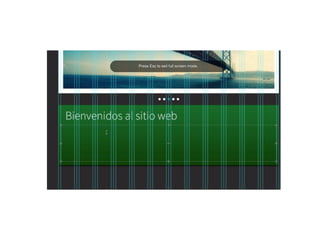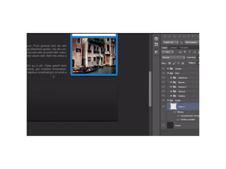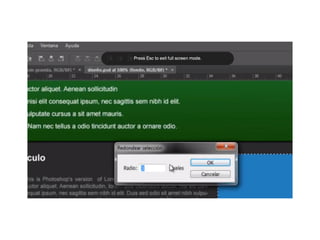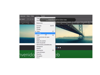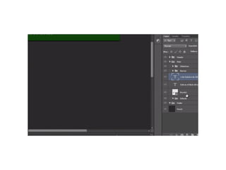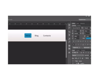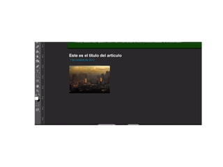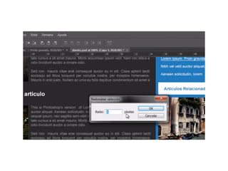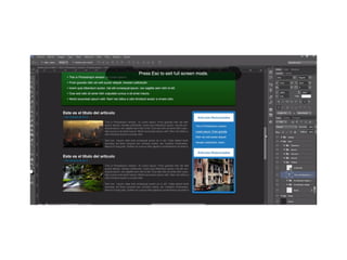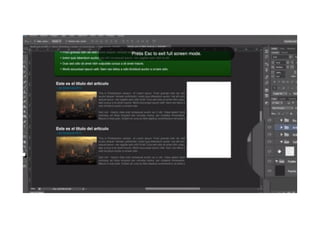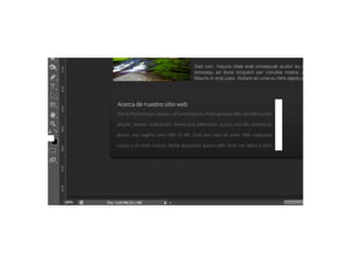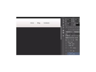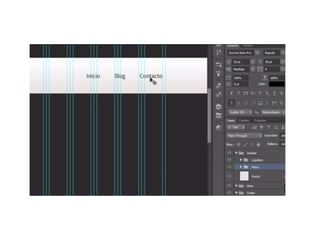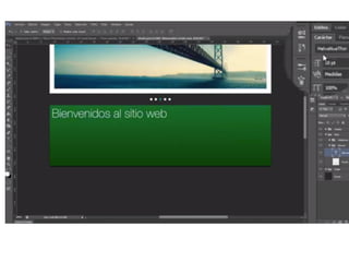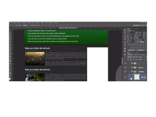 El documento proporciona instrucciones para crear el diseño de un sitio web utilizando Photoshop. Estas instrucciones incluyen crear capas, carpetas y grupos para el header, main content y footer. Dentro de estas secciones se agregan logotipos, menús, sliders de imágenes, artículos, widgets y redes sociales. El diseño final se guarda con la estructura y estilos apropiados para facilitar el desarrollo del sitio.