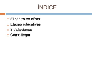 El documento presenta el instituto IES Cruz del Sur. Se inauguró en 1999 y actualmente cuenta con alrededor de 800 nuevos estudiantes cada año, 20 familias profesionales y 6 departamentos didácticos. El profesorado está formado por 152 profesores. El centro ofrece educación secundaria obligatoria, bachillerato, formación profesional de grado medio y superior, y formación de adultos, tanto en turno diurno como vespertino. Las instalaciones incluyen aulas, talleres y laboratorios. El instituto participa en
