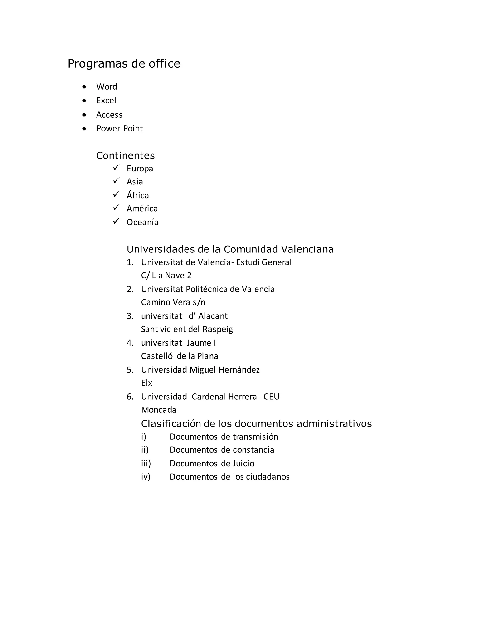 Este documento presenta una lista de programas de office, continentes, universidades de la Comunidad Valenciana, clasificación de documentos administrativos, herramientas de recuperación de información en internet y un esquema numerado de regiones de la Comunidad Valenciana.