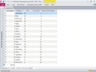 Este documento describe la organización de una tienda departamental y las entidades y relaciones involucradas. La tienda organiza la mercancía en departamentos, cada uno con un código, categoría, código de encargado y zona. Los productos tienen código, nombre, descripción, código de departamento, precio de costo y precio al público. El personal tiene código, nombre, domicilio, puesto y código de departamento donde trabaja. Cada departamento tiene un encargado y un producto puede pertenecer a uno o más departamentos.