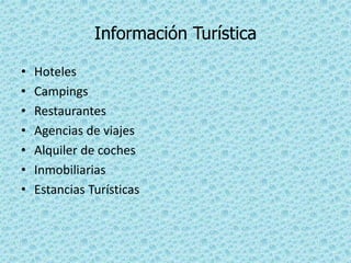 La información proporciona recursos turísticos como hoteles, campings y restaurantes para las ciudades de Albacete, Ciudad Real, Cuenca, Guadalajara y Toledo en Castilla-La Mancha, incluyendo atracciones turísticas específicas como el Castillo de Almansa, las Lagunas de Ruidera y las casas colgadas de Cuenca.